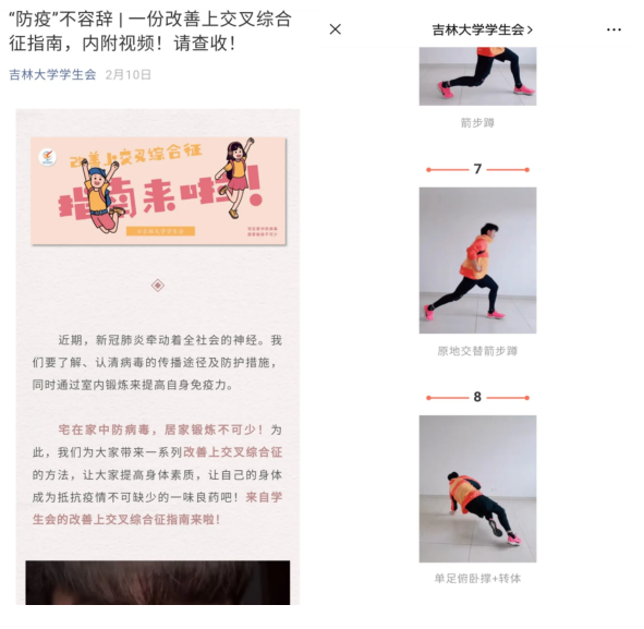 疫情期间,EMC易倍员工会协助校员工会制作了三期线上锻炼的推文,累计阅读量5000余次。推文内容是由公司员工会骨干张熙策、姜熙宁、赵偲艺等向大家普及运动常识和各种健身动作,并组建了健身打卡群,居家期间为同学们答疑解惑,分享经验。